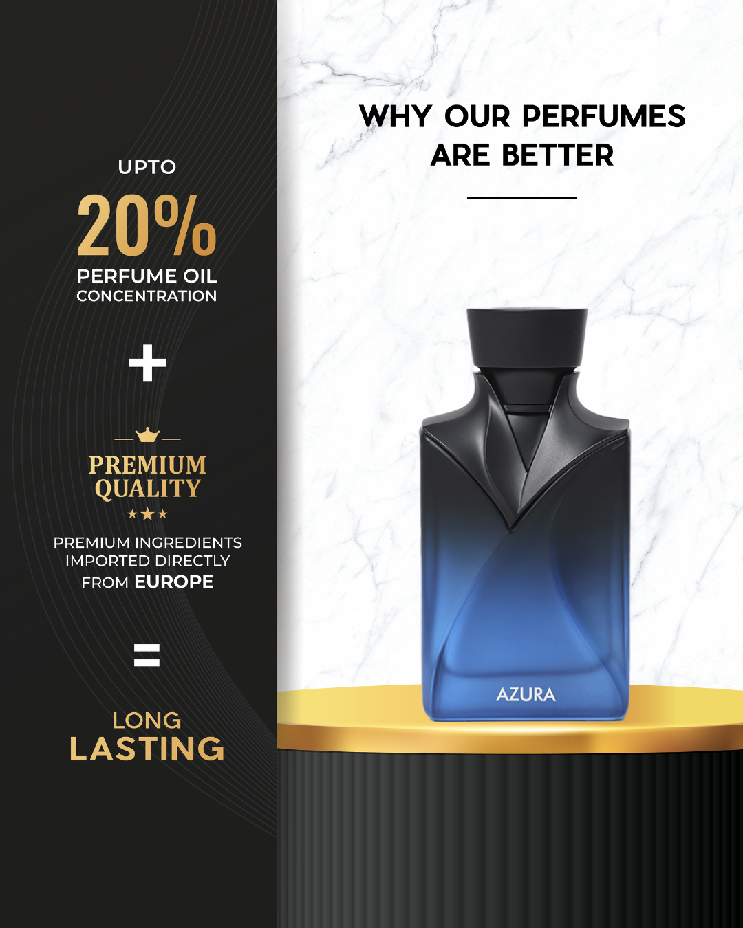 At its base, musk and fresh woods create a smooth, cool finish—leaving behind an aura of effortless charm. Azura is for the man who never settles, always chasing the next horizon.