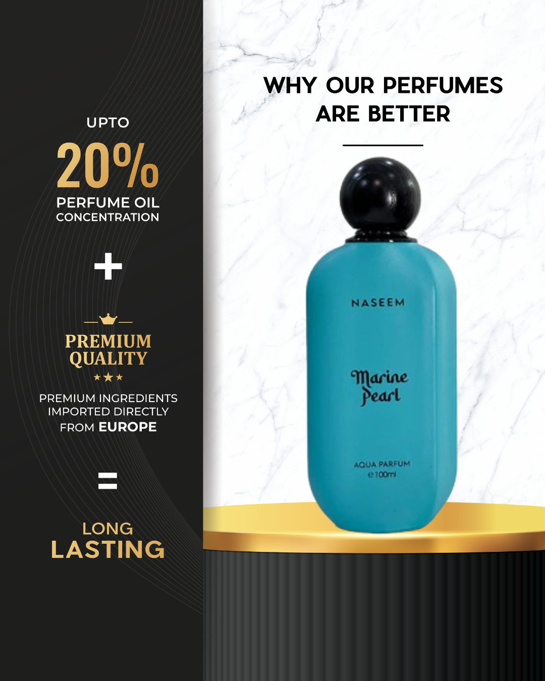 Marine Pearl Aqua Parfum is a captivating blend of woody, fresh, musky, and ambery notes. Opening with a burst of pineapple, blackcurrant, and bergamot